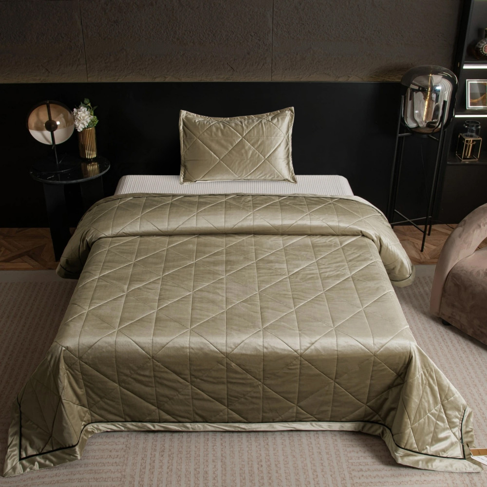 Геометрический узор на покрывале выполнен с использованием термостежки, что придаёт изделию особую изысканность и подчёркивает элегантность интерьера.