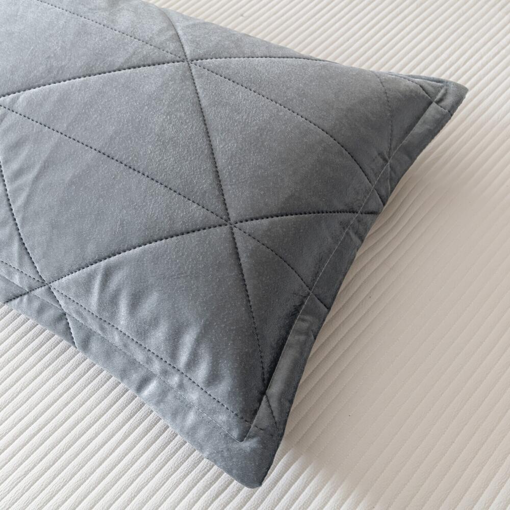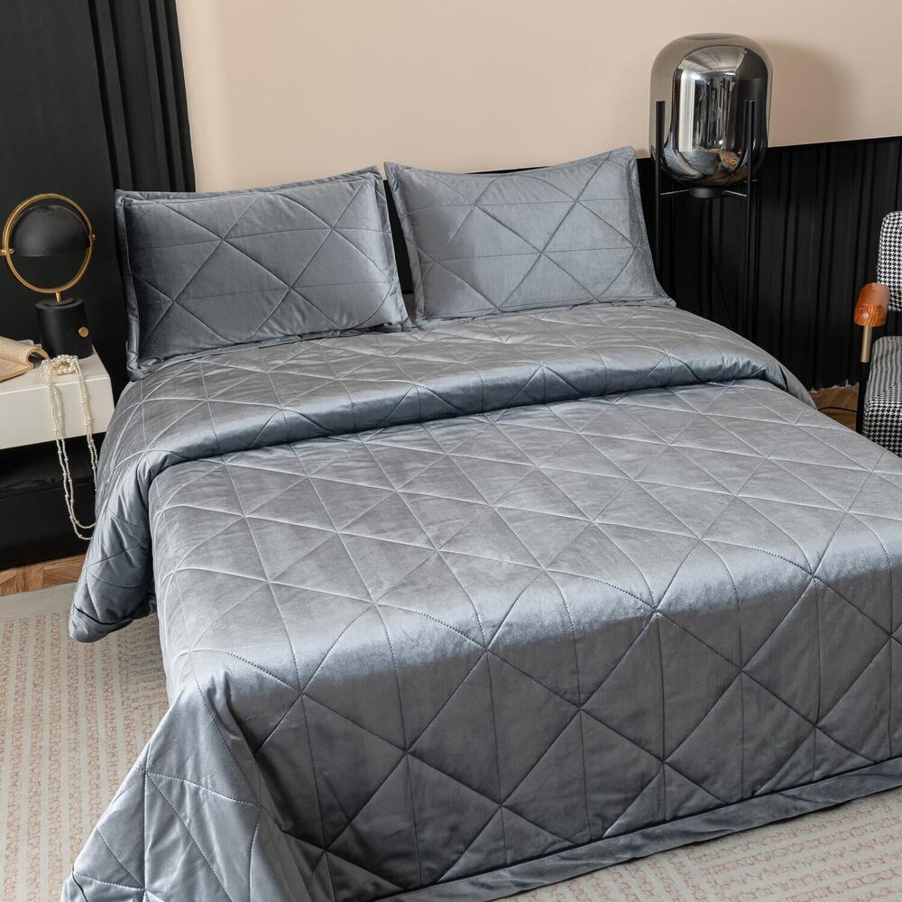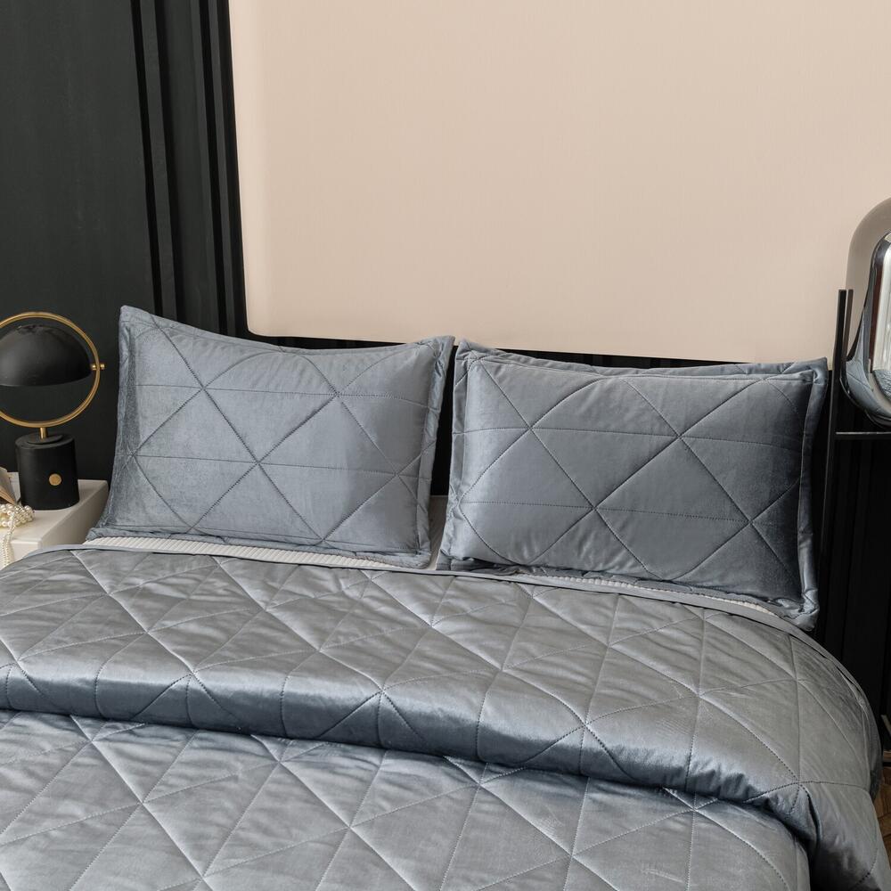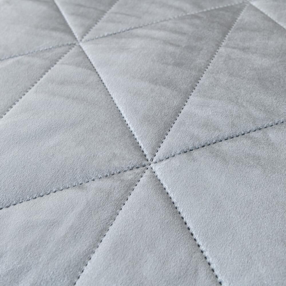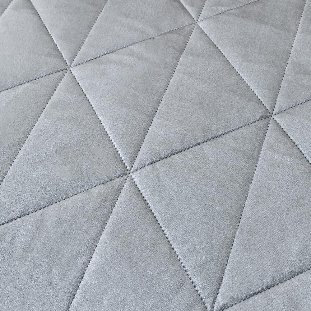 Геометрический узор на покрывале выполнен с использованием термостежки, что придаёт изделию особую изысканность и подчёркивает элегантность интерьера.
