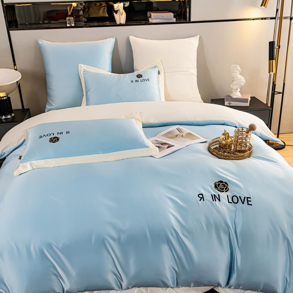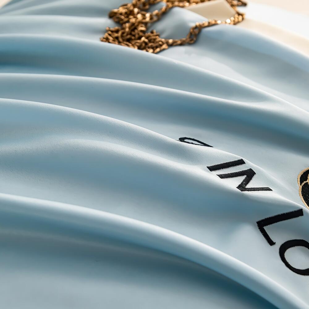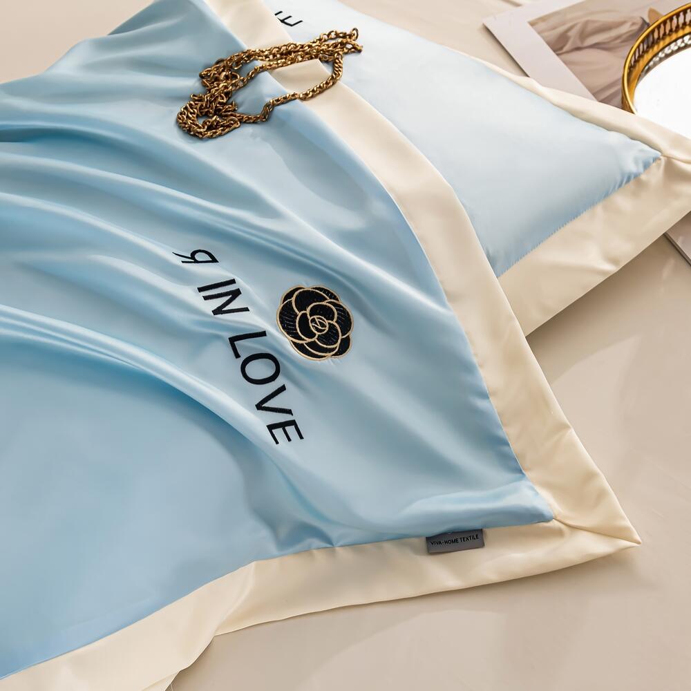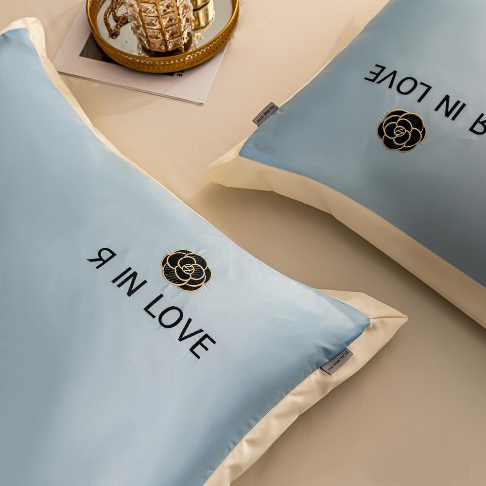 Каждый комплект украшен элегантной вышивкой с цветком и фразой "Я IN LOVE". Это придает постельному белью особый шарм, делая его прекрасным подарком для любимых.