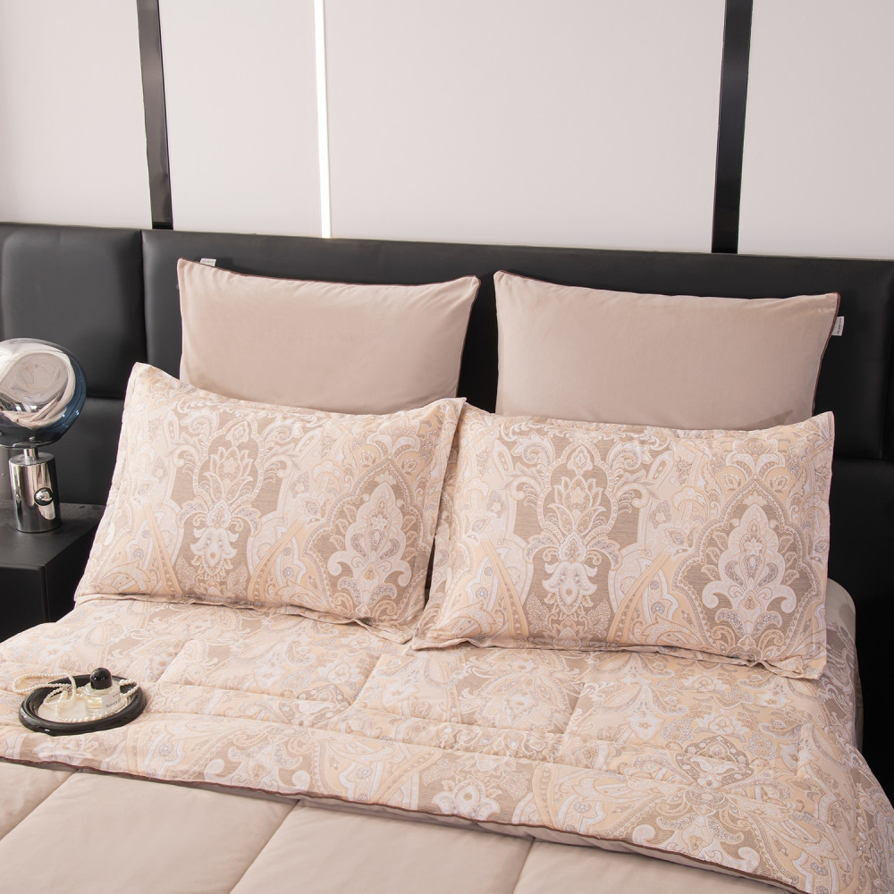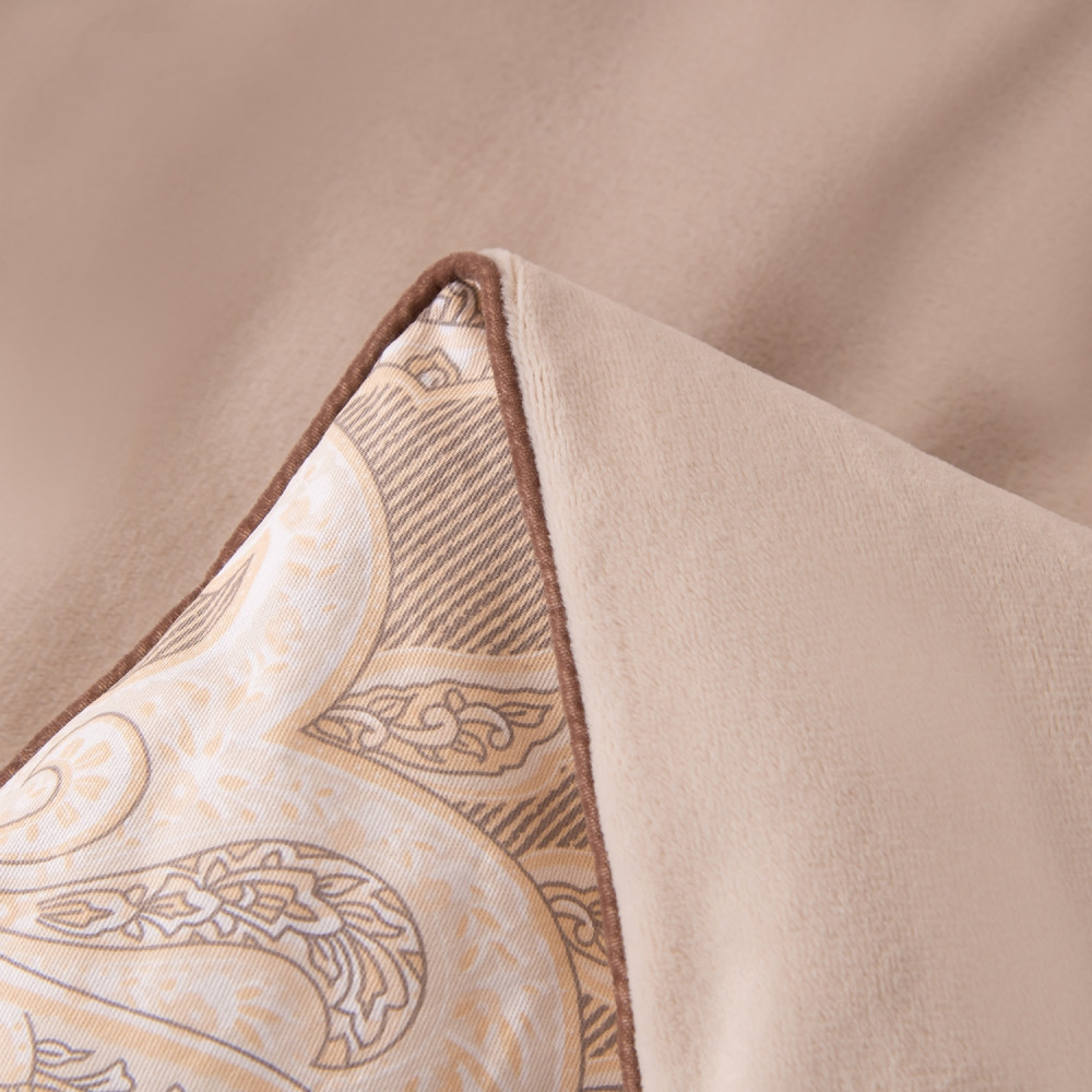 В комплект входят четыре наволочки: 50x70 см (2 шт) с запАхом (кармашком) выполнены из сатина 100% хлопка, с ушками и широким кантом по периметру; 70x70 см (2 шт) на молнии - верх из мягкого велюра, низ из сатина 100% хлопка, оформлены бархатным кантом.