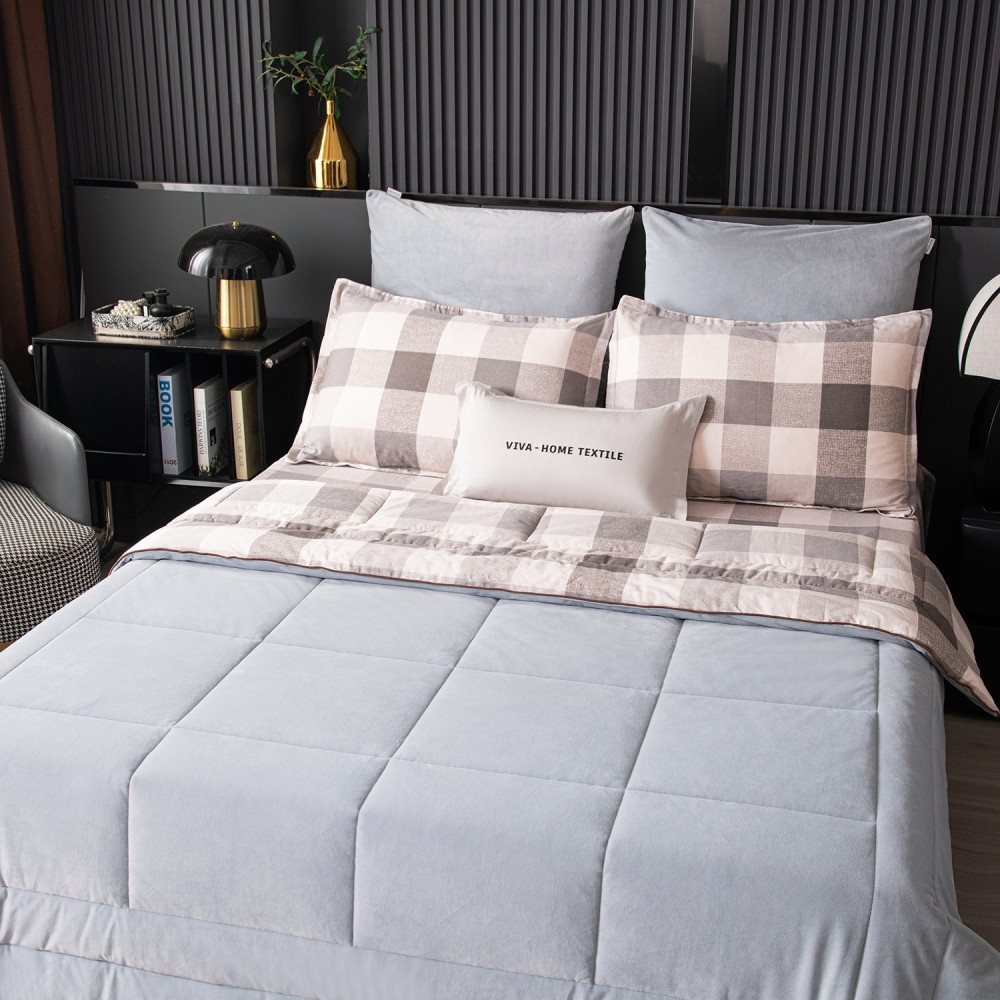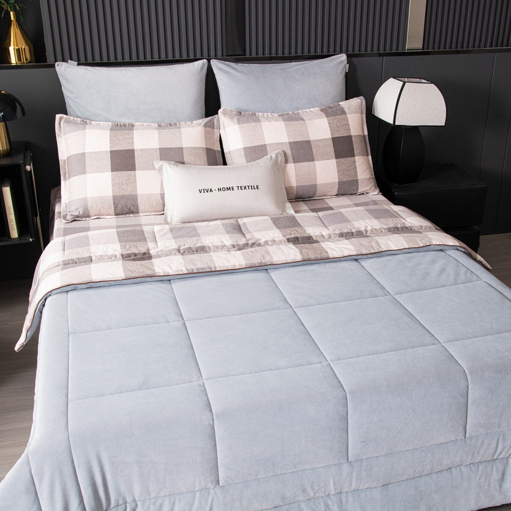 Одеяло выполнено с изысканной геометрической стёжкой и оформлено бархатным кантом. Верхняя сторона: мягкий велюр, придающий комплекту благородный вид и особую уютность, нижняя сторона: сатин из 100% хлопка, обеспечивающий естественную воздухопроницаемость и комфорт во время сна. Наполнитель: современное 100% эковолокно микрогель, лёгкое, гипоаллергенное и сохраняющее форму даже после многократных стирок. Зимой под таким одеялом тепло и уютно, а летом благодаря отличной циркуляции воздуха не будет жарко.