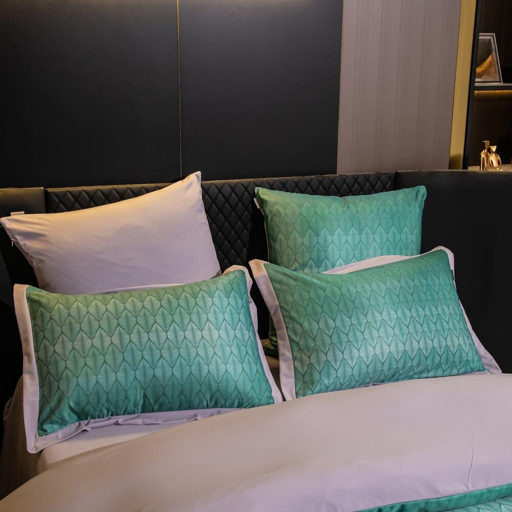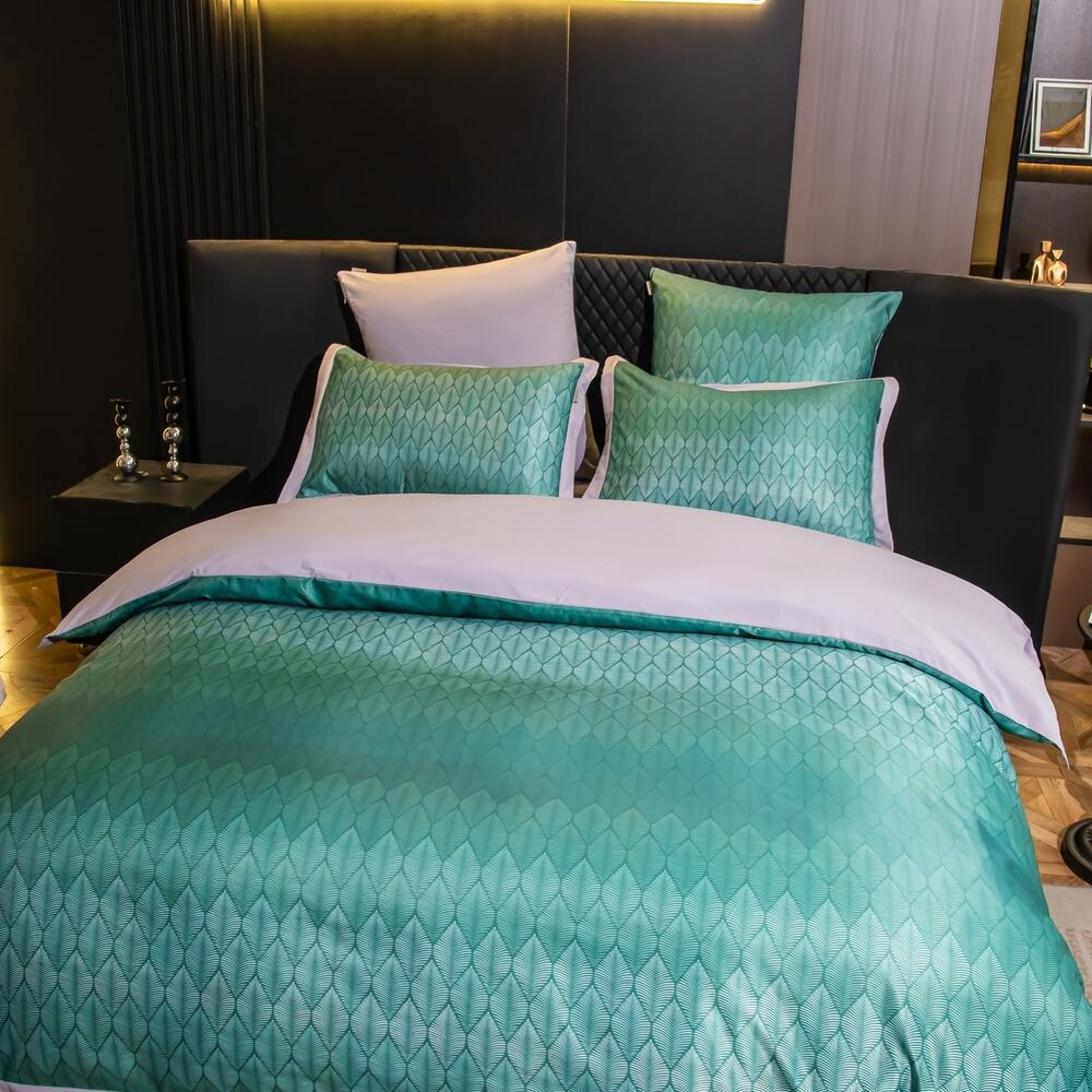 Ткань компаньон: Верх пододеяльника - мерсеризованный сатин, низ пододеяльника - сатин. Наволочки 50*70 см и 70*70 см с разных сторон разной расцветки. Пододеяльник с разных сторон разного цвета. Простыня однотонная такого же цвета, как низ пододеяльника.