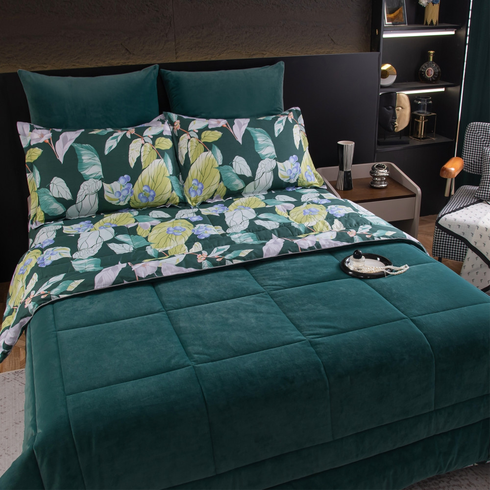 Одеяло выполнено с изысканной геометрической стёжкой и оформлено бархатным кантом. Верхняя сторона: мягкий велюр, придающий комплекту благородный вид и особую уютность, нижняя сторона: сатин из 100% хлопка, обеспечивающий естественную воздухопроницаемость и комфорт во время сна. Наполнитель: современное 100% эковолокно микрогель, лёгкое, гипоаллергенное и сохраняющее форму даже после многократных стирок. Зимой под таким одеялом тепло и уютно, а летом благодаря отличной циркуляции воздуха не будет жарко.